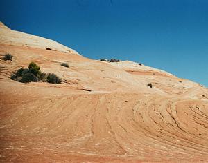 Enjoy the stunning view of a rock formation in Utah, with distinct water lines etched into its surface. The lines tell a story of the passage of time, as the rock was slowly worn down and reshaped by the flow of water over thousands of years. The colors of the rock range from deep shades of red and orange to light beige, creating a beautiful contrast against the clear blue sky. The texture of the rock is equally striking, with deep grooves and ridges carved into its surface, creating a visual feast for the eyes. As you gaze upon the photograph, you're reminded of the power of nature and the immense changes that can occur over time. The image is a testament to the beauty and complexity of the natural world, and a reminder of the importance of protecting these precious places for future generations to enjoy.