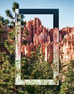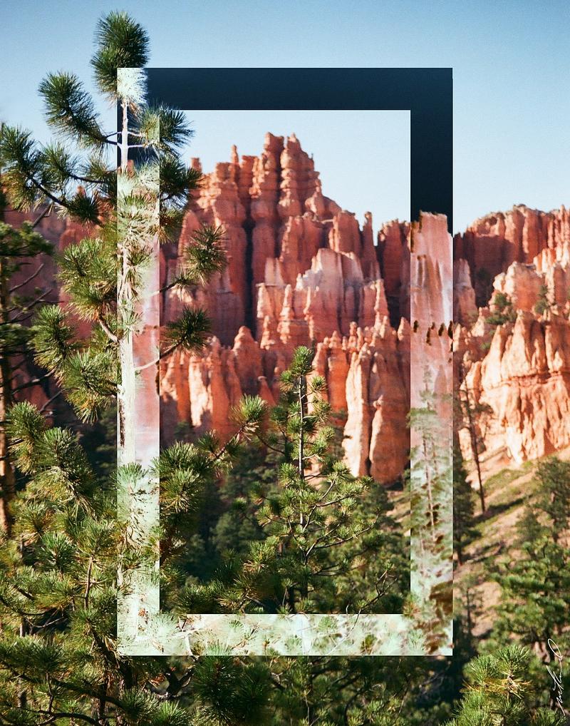 Captured in the grain of the film sits the awe-inspiring beauty of the pink hoodoos in Bryce Canyon, with towering rock formations standing out against the blue sky. The foreground is adorned with lush green pine trees, adding a natural and vibrant contrast to the scene. The square is precisely placed, and the inverted image creates an illusion that's both mesmerizing and surreal. The combination of vibrant colors and the inverted image creates a unique and compelling composition that's both intriguing and beautiful. The photograph invites the viewer to explore the image further and contemplate the intricate interplay of light, color, and form.