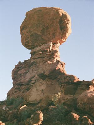 You stand before a remarkable natural wonder in Arches National Park, Utah - Balanced Rock. The massive sandstone boulder, with its distinct red-orange hue, sits precariously atop a slender pedestal, appearing as though it could tumble down at any moment. Despite its precarious position, the rock has stood the test of time, defying the laws of gravity and serving as a testament to the raw power of nature. As you gaze up at the towering formation, you're struck by its beauty and the majesty of the surrounding landscape. The barren terrain stretches out before you, with rugged mountains and distant mesas visible in the distance. You feel a sense of reverence for the natural world and an appreciation for the awe-inspiring beauty that surrounds you.
